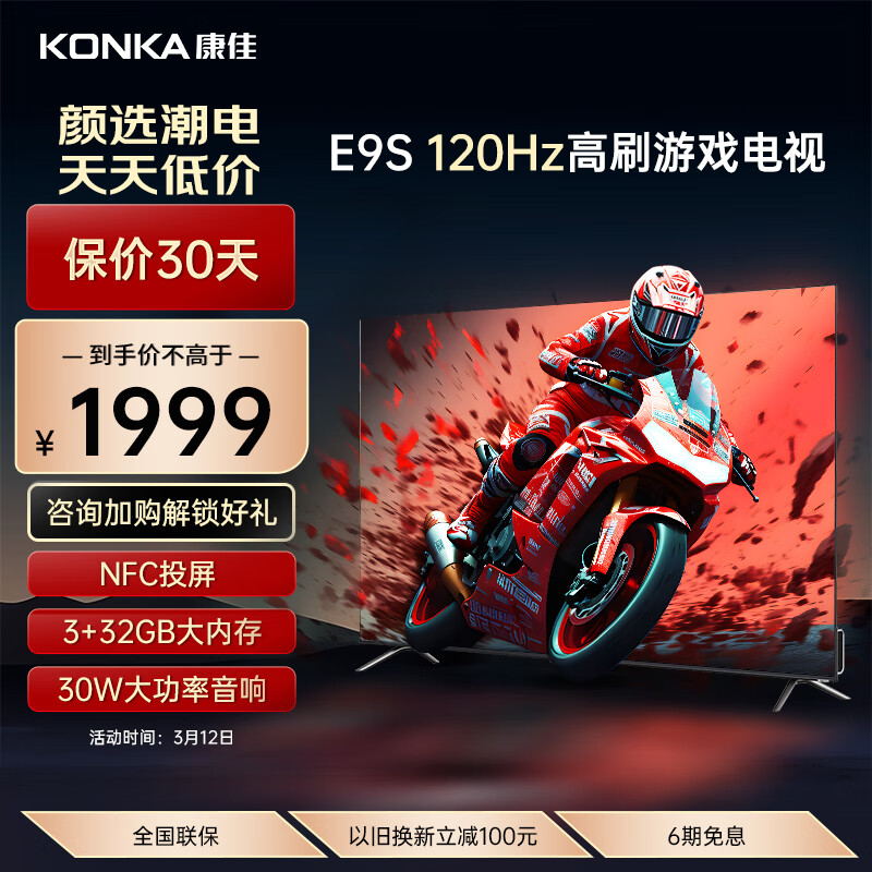 康佳电视 55E9S 55英寸 3+32GB 120HzMEMC高刷护眼 4K超清屏投屏 智能语音液晶平板电视机以旧换新价格:1999.00元!