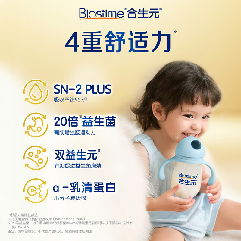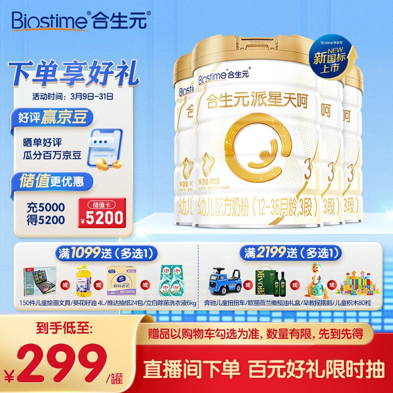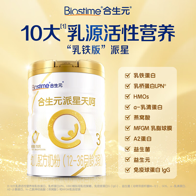 合生元(BIOSTIME)派星天呵幼儿配方奶粉 3段(12-36个月) 700克*4罐新国标乳铁蛋白价格:1328.00元!