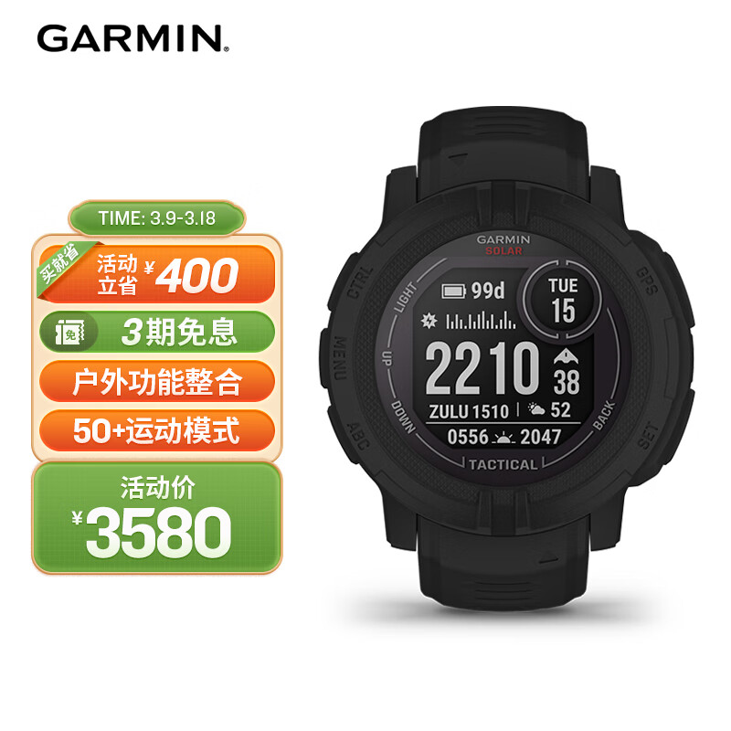 佳明(GARMIN)本能2户外探险GPS防水多星定位运动智能手表太阳能战术版暗夜黑价格:3580.00元!