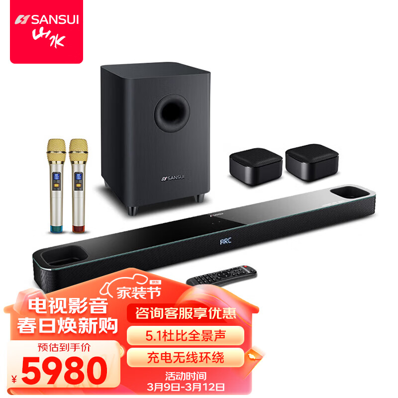 山水(SANSUI)DV-95D回音壁5.1声道杜比全景声电视音响套装 家庭影院 无线环绕Soundbar条形音箱 10英寸低音炮价格:5980.00元!