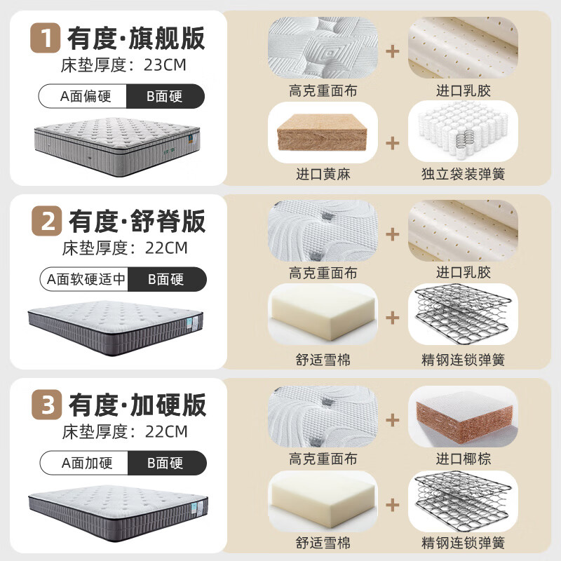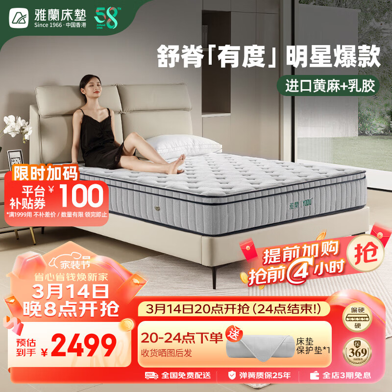 雅兰乳胶床垫偏硬家用天然黄麻独立弹簧床垫 有度旗舰版 1.5*1.9米价格:2999.00元!