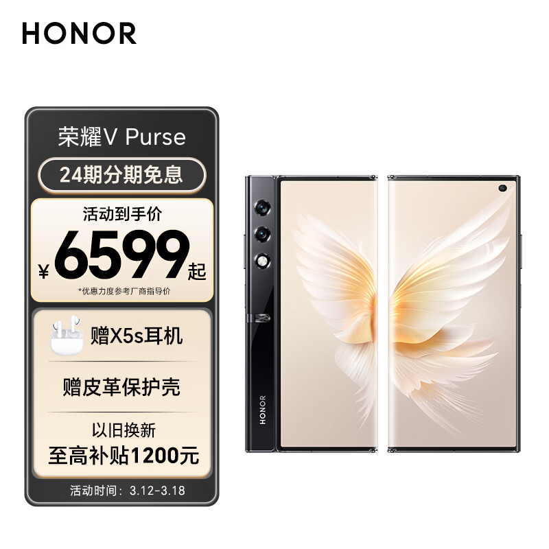 荣耀V Purse 折叠屏 8.6mm超轻薄 2K超清大屏 超自由写真相机 5G手机 16GB+512GB 雅黑色价格:6599.00元!