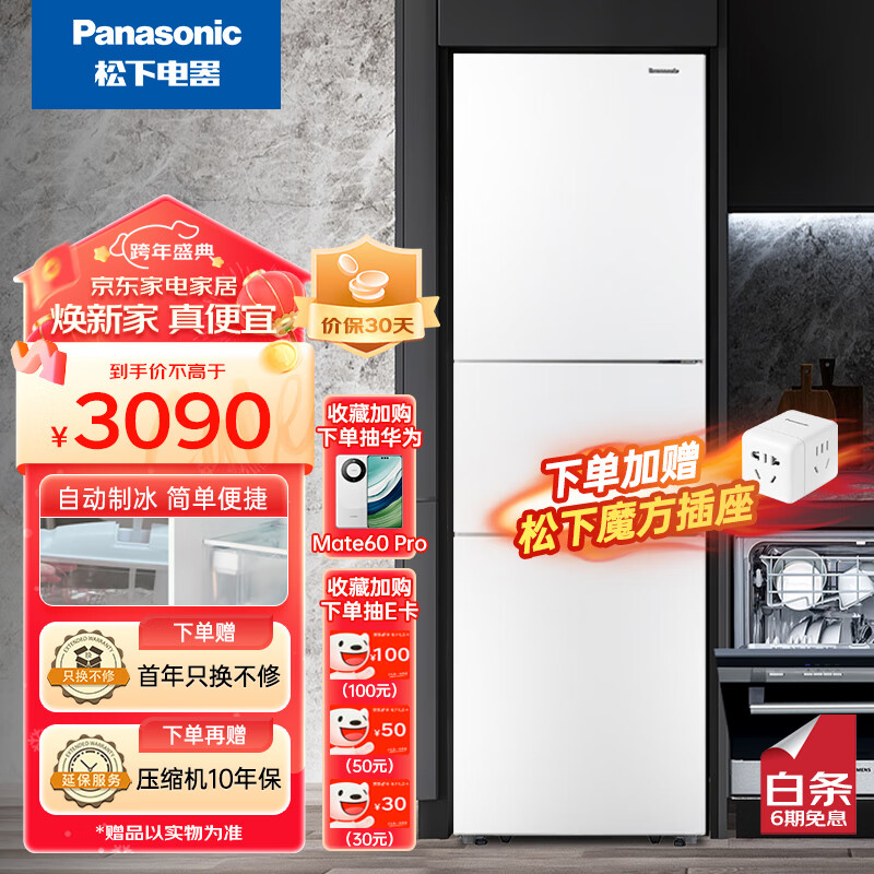 松下(Panasonic)303升三门冰箱京东小家智能生态一级能效银离子kang菌自动制冰家用冰箱NR-JS30AX1-W优选以旧换新价格:3090.00元!