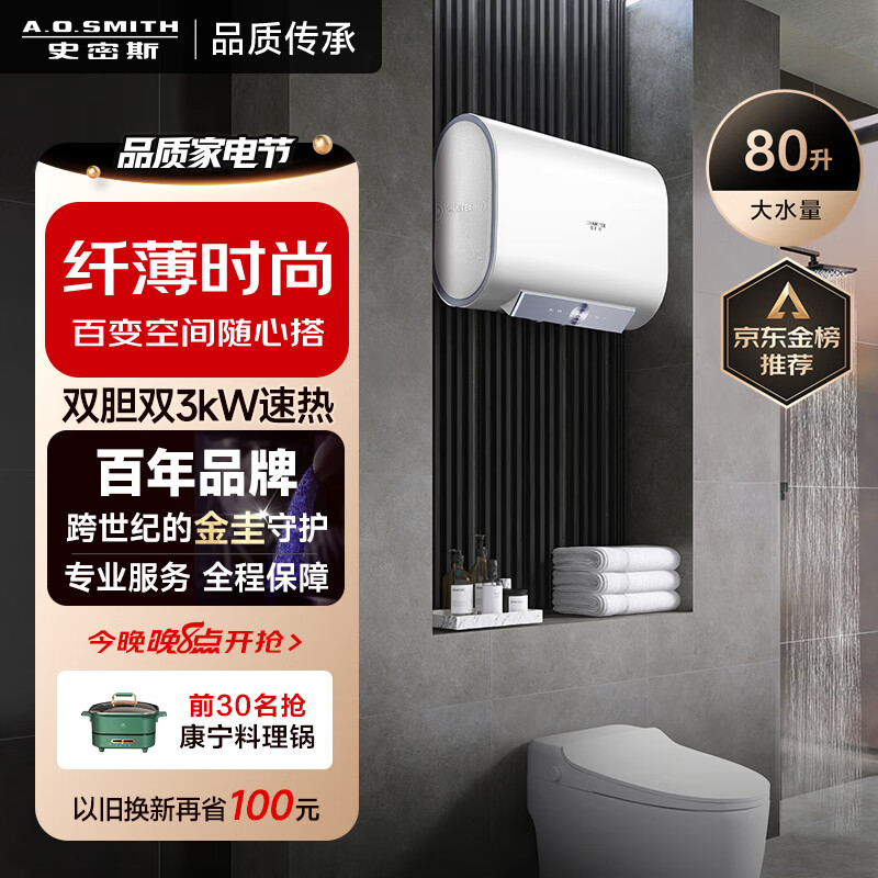 史密斯(A.O.SMITH)佳尼特80升电热水器 纤薄双胆扁桶 金圭特护 双棒双3kW速热 雪域白 CTE-80HT1多种洗浴模式价格:3199.00元!