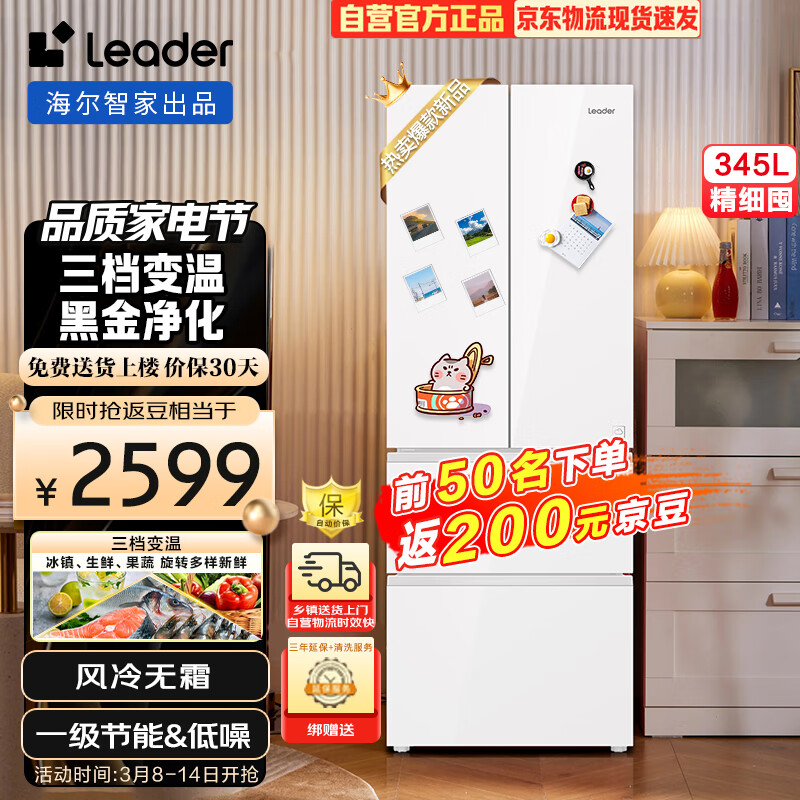 Leader 海尔智家出品345升彩晶风冷无霜净味一级能效变频节能法式四门多门电冰箱BCD-345WLLFDD9CW1U1价格:2799.00元!