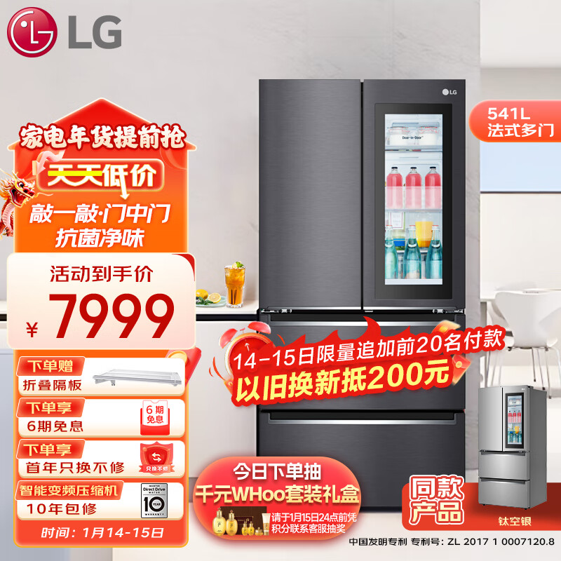 LG敲一敲门中门 541升大容量变频法式多门 家用风冷无霜 多维风幕系统 节能净味冰箱F532MMC78B黑价格:7999.00元!