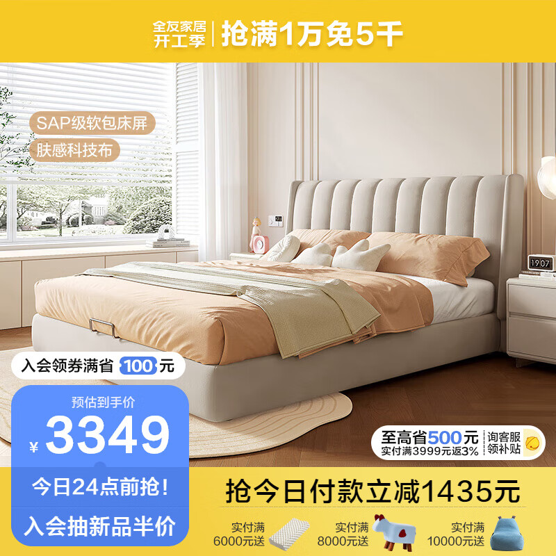 全友家居床现代简约科技布床1.8米双人床高弹海绵床屏齐边大床105207C价格:4784.29元!