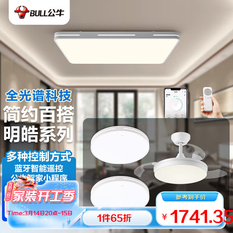 公牛(BULL)吸顶灯全光谱蓝牙遥控MX-C130E-CS明皓客厅灯(130W+48W*2+吊扇)价格:2679.00元!