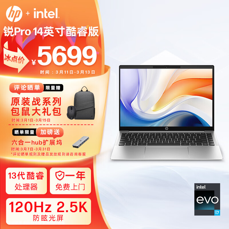 惠普(HP)锐Pro 14英寸轻薄笔记本电脑(英特尔酷睿13代i7-1360P 32G 1T 2.5K 高色域 Evo认证 长续航高性能)价格:5699.00元!