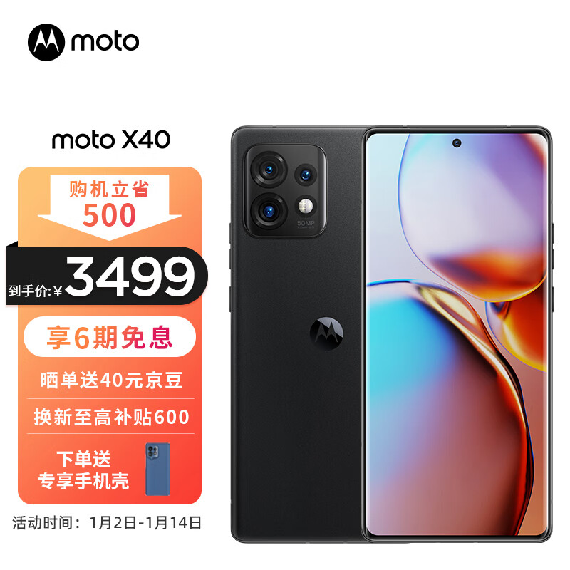 摩托罗拉moto X40 第二代骁龙8 165Hz四曲臻彩屏 IP68防水 125W闪充 护眼黑科技 5G手机 12GB+256GB 墨晶黑价格:3799.00元!