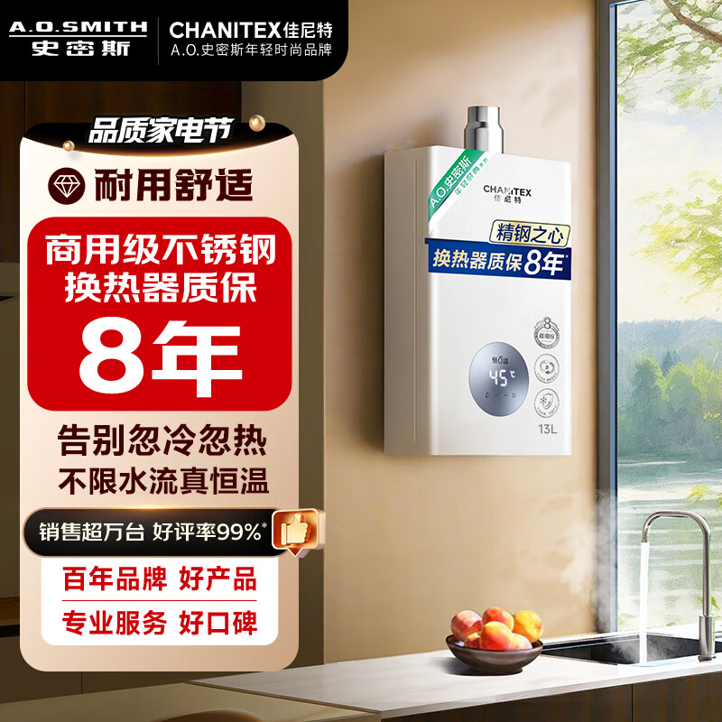 史密斯(A.O.SMITH)佳尼特13升燃气热水器 不锈钢换热器包8年 精控恒温 抗风防冻 家用天然气 JSQ26-TC1价格:2198.90元!