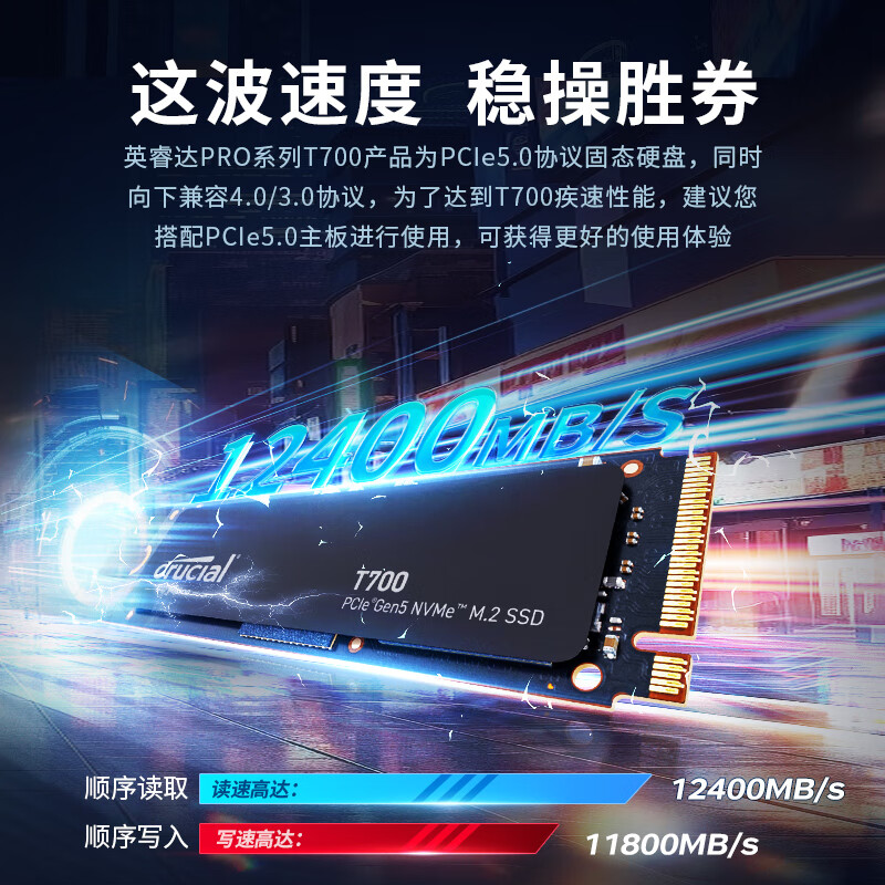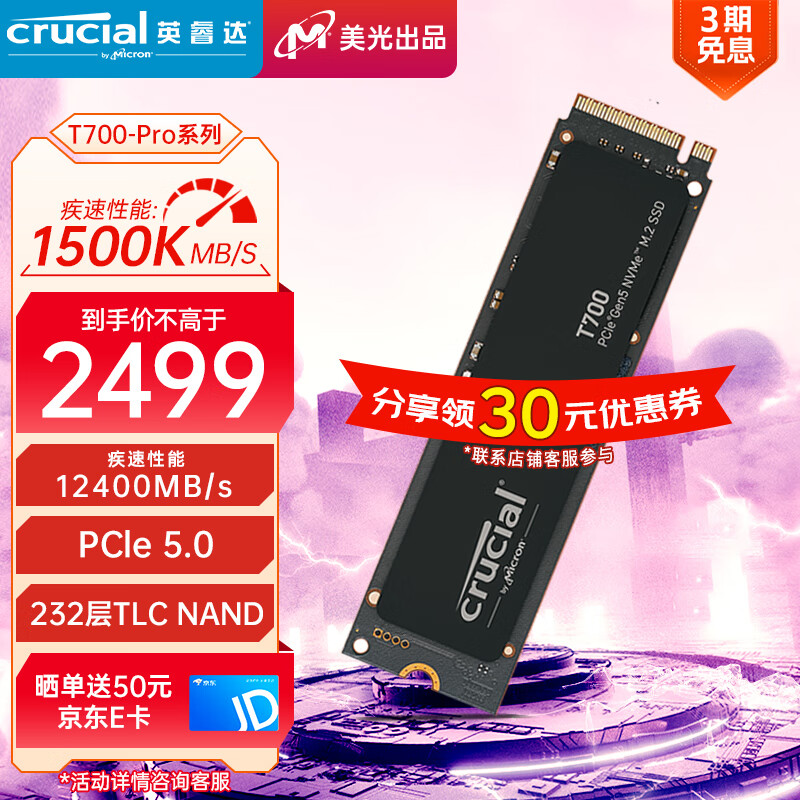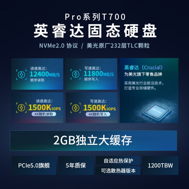 Crucial英睿达 美光 2TB SSD固态硬盘 M.2接口(NVMe协议)四通道PCIe5.0 读速12400MB/s Pro系列T700价格:2499.00元!
