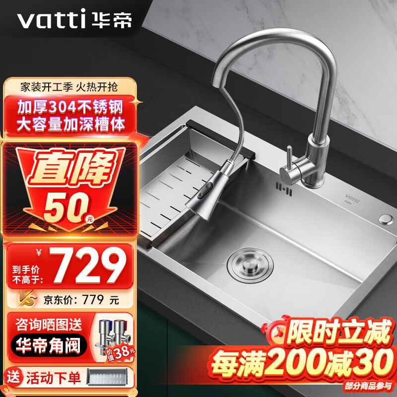 华帝(VATTI)厨房水槽洗菜盆一体盆单槽 大单槽水池盆洗碗槽洗菜池单盘不锈钢价格:1029.00元!