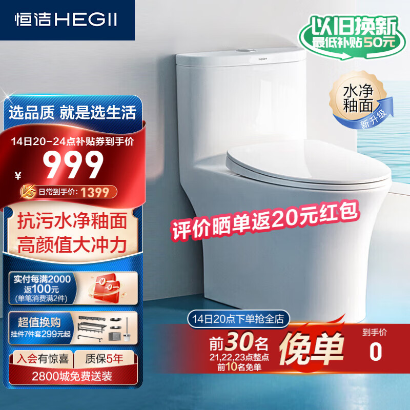 恒洁(HEGII)马桶506 水净釉面家用大冲力虹吸式坐便器HC0506PT-305价格:999.00元!