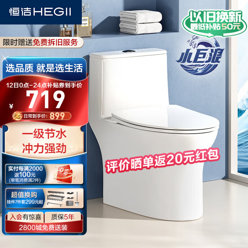 恒洁(HEGII)马桶513 家用虹吸小巨浪马桶小户型卫生间坐便器HC0513PT-350价格:819.00元!