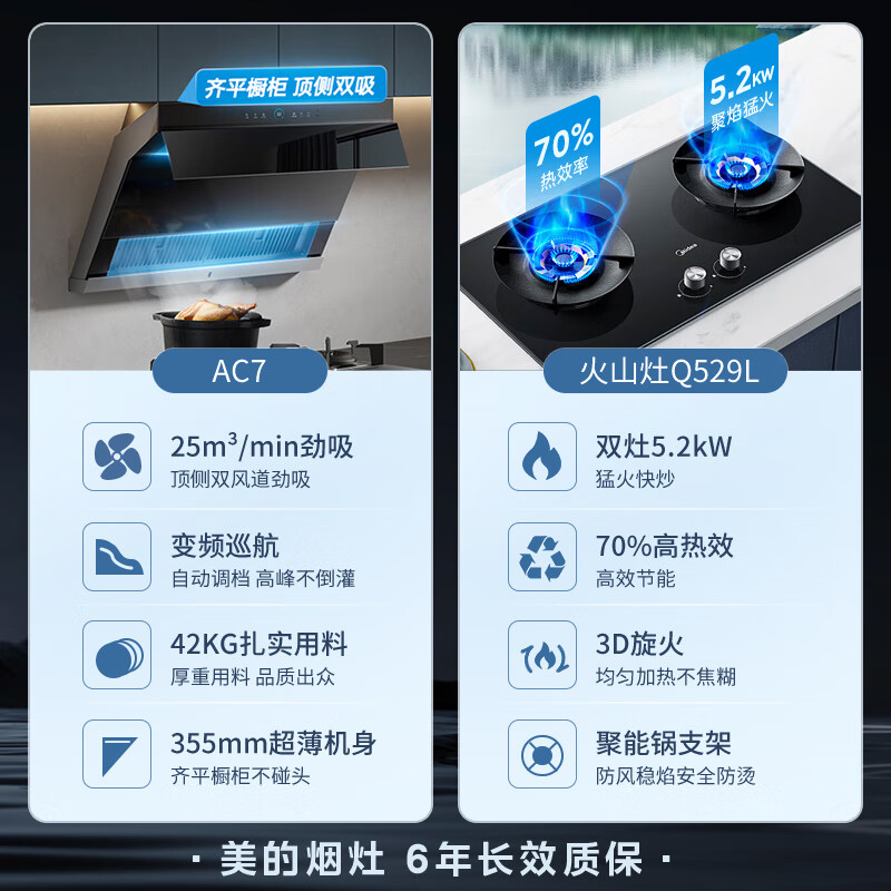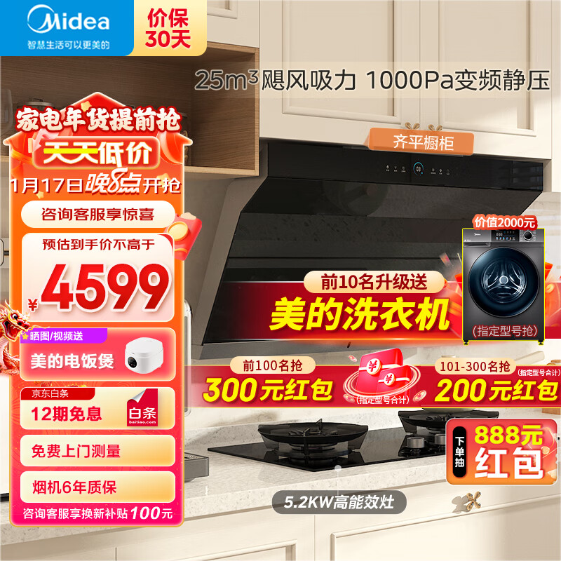 美的(Midea)抽油烟机灶具套装 顶侧双吸油烟机家用25风量变频巡航超薄双吸烟灶套装AC7+Q529L天然气套装价格:4599.00元!