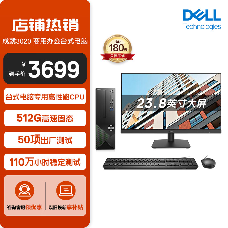 戴尔(Dell)成就3020 台式电脑主机 (酷睿13代i5-13400 8G 512GSSD)23.8英寸大屏显示器 高性能CPU价格:3699.00元!
