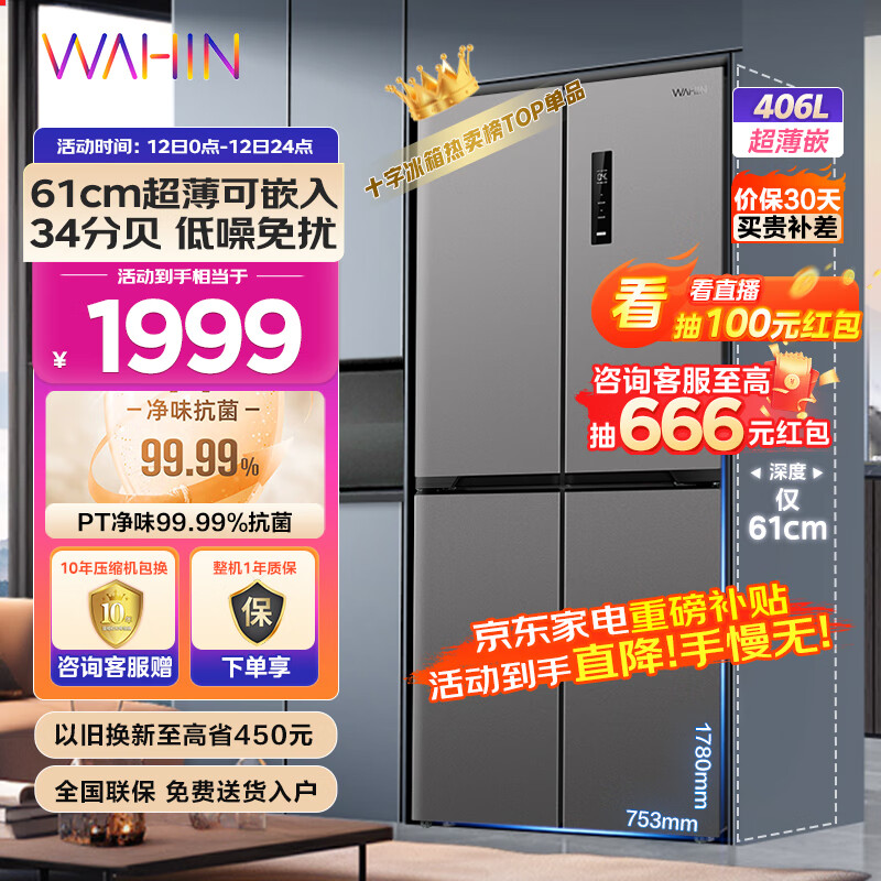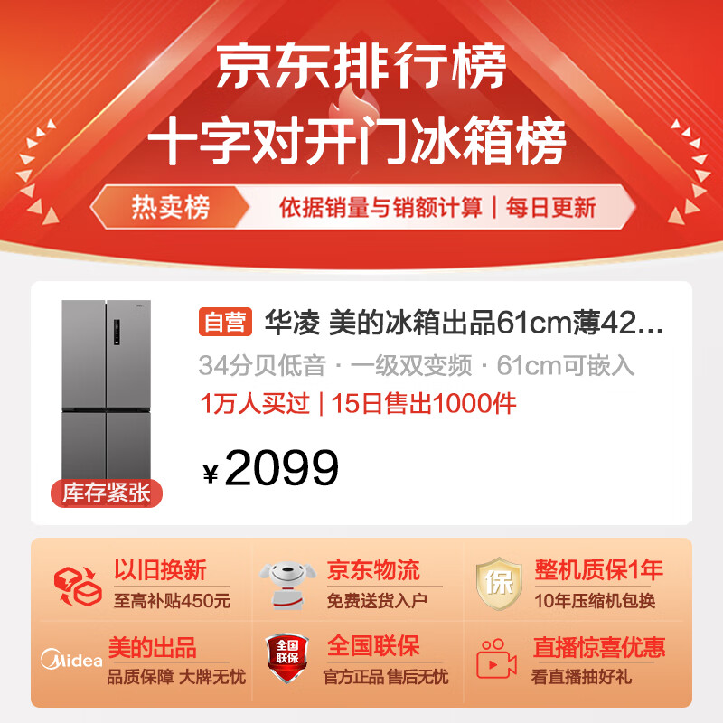 华凌 美的冰箱出品61cm薄426十字双开门四门多门大容量PT净味家用低音轻音冰箱HR-426WSP超薄可嵌入价格:1999.00元!