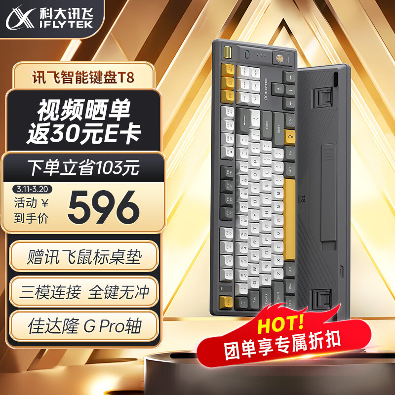 科大讯飞AI机械键盘T8 无线三模 双区87键全键无冲 全键PBT热升华 吃鸡LOL 70天超长续航 智能语音 红轴价格:699.00元!