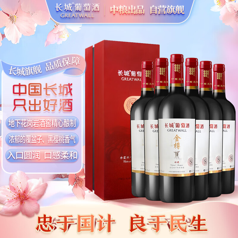 长城 金樽 珍藏赤霞珠干红葡萄酒 礼盒 750ml*6瓶 整箱装(含礼品袋)价格:1365.00元!