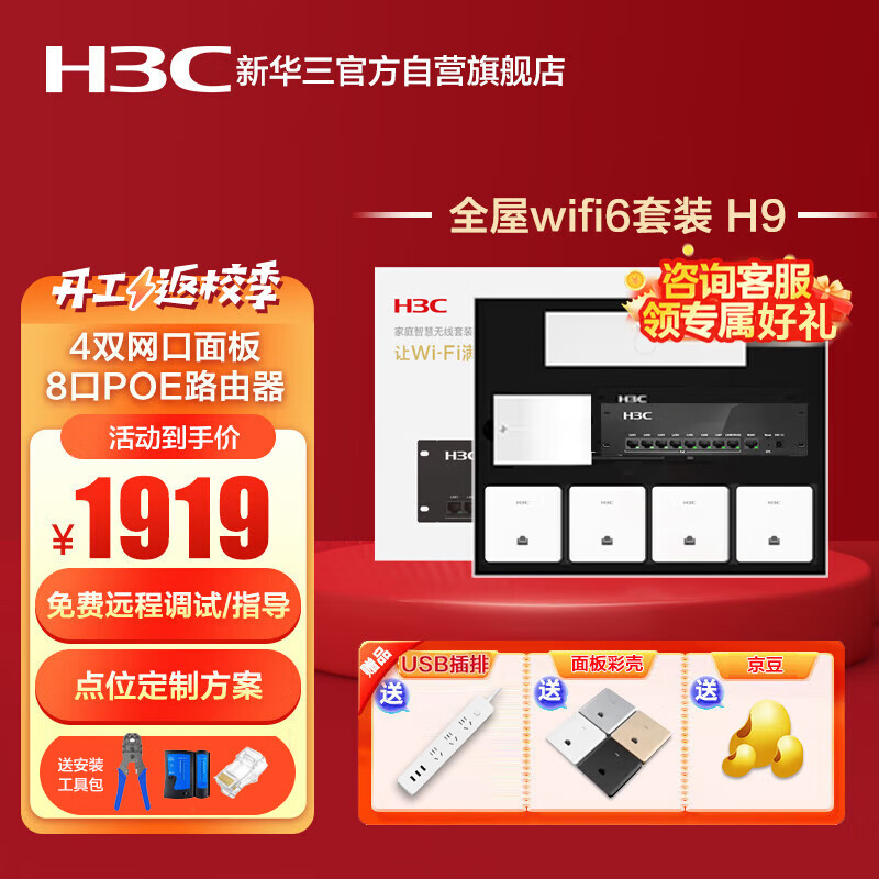 华三(H3C)全屋wifi套装4个无线双频ap面板+8口PoE路由器企业分布式千兆路由器无缝漫游价格:1919.00元!