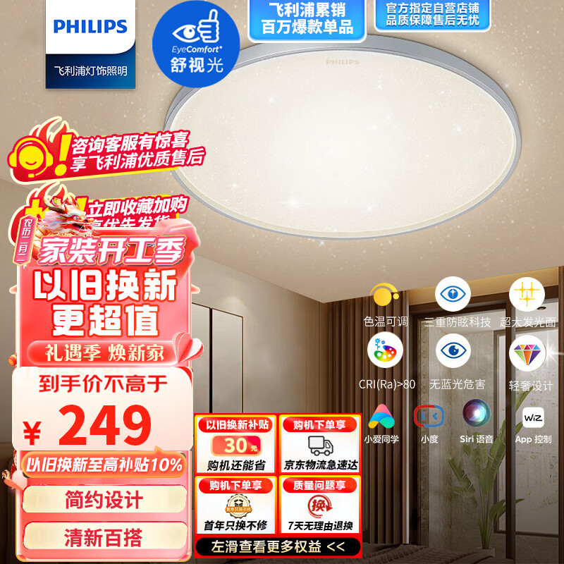 飞利浦led吸顶灯卧室灯客厅灯书房餐厅智能灯饰灯具智控调光24W星环 金价格:479.00元!