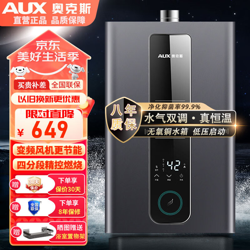 奥克斯 燃气热水器 天然气热水器 13升家用强排式 变频恒温速热水气双调节能省气浴室公寓 自行安装 DA76价格:649.00元!