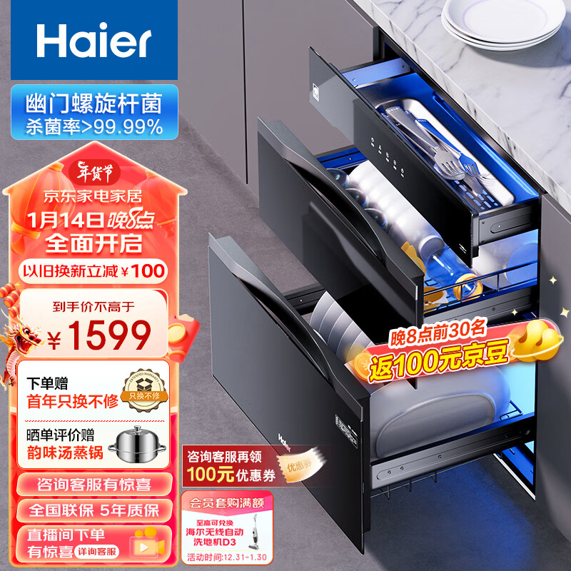 海尔(Haier)消毒柜家用嵌入式 消毒碗柜 奶瓶消毒烘干一体机 光波巴氏消毒新升级 母婴童锁 110L三门三抽EB031价格:1599.00元!