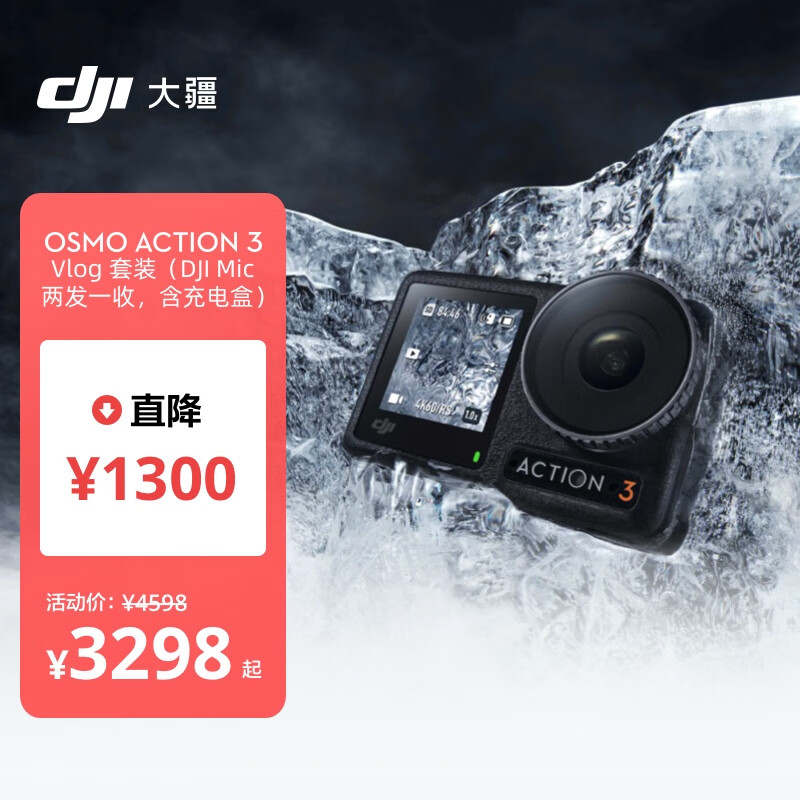 大疆 DJI Osmo Action 3 Vlog 套装(DJI Mic 一拖二) 运动相机 手持摄像机+随心换1年版+128G内存卡价格:3496.90元!