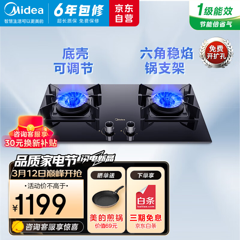 美的(Midea)极光系列燃气灶双灶家用5.0KW大火力黑晶面板台嵌两用双灶 六脚锅支架 液化气灶Q70价格:1199.00元!