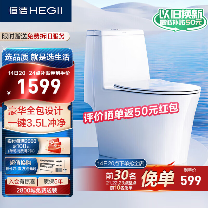 恒洁(HEGII)马桶143 超旋风大冲力一键速冲除污连体坐便器HC0143DT-305价格:1799.00元!