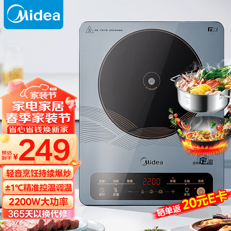 美的(Midea)电磁炉 2200W大功率家用触控按键 耐用面板 9档恒匀火定时功能电磁灶火锅炉MC-22EB15价格:249.00元!