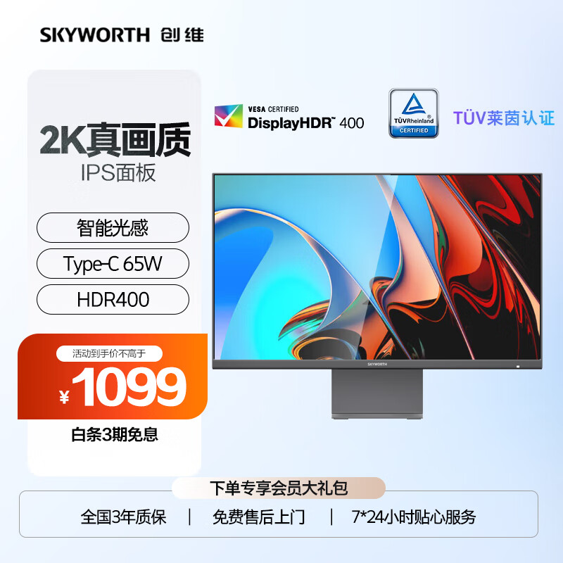 创维(Skyworth)27英寸 办公显示器 2K 75Hz IPS 65W Type-C HDR400 硬件低蓝光 智能光感 电脑显示屏 F27B40Q价格:1199.00元!