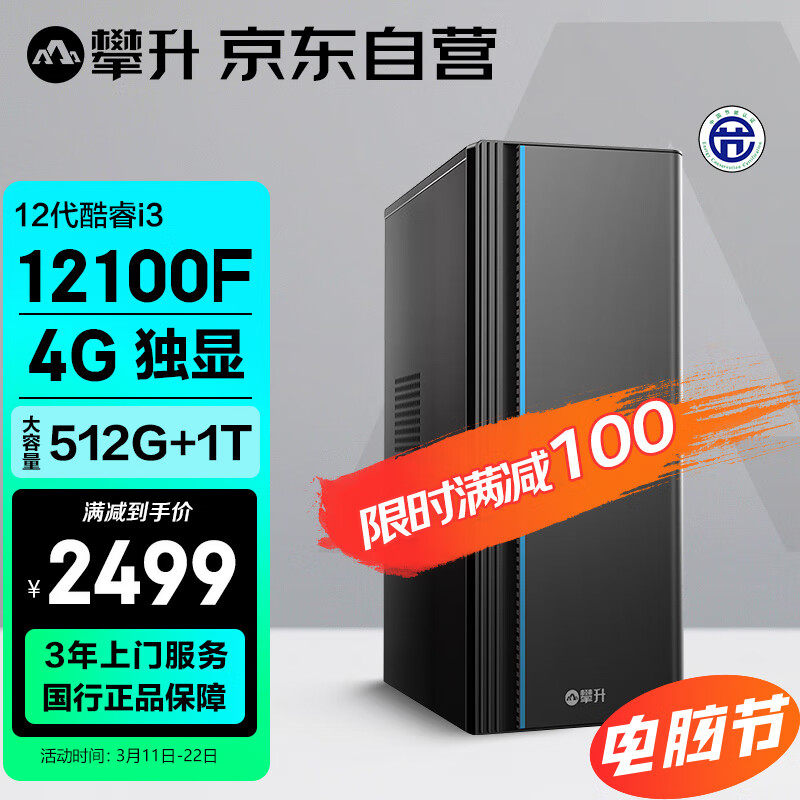 攀升 商睿3 酷睿i3办公商用家用台式电脑主机(12代i3-12100F 16G 512G+1T 4G独显 Type-C WiFi)价格:2599.00元!