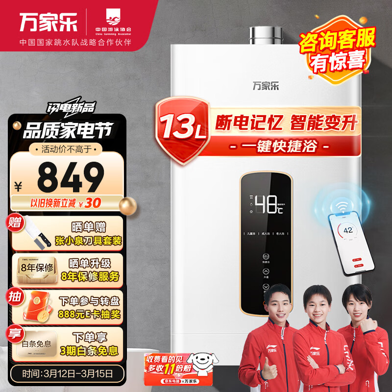 万家乐 13升燃气热水器(天然气)智能变升节能一键智能浴高温防烫锁断电记忆JSQ26-13DP2【主动防冻】价格:849.00元!