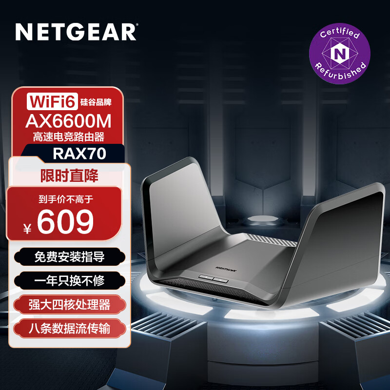 网件(NETGEAR)RAX70 AX6600 wifi6无线路由器千兆电竞/四核三频/MU-MIMO/家用网络全屋覆盖/认证翻新价格:709.00元!
