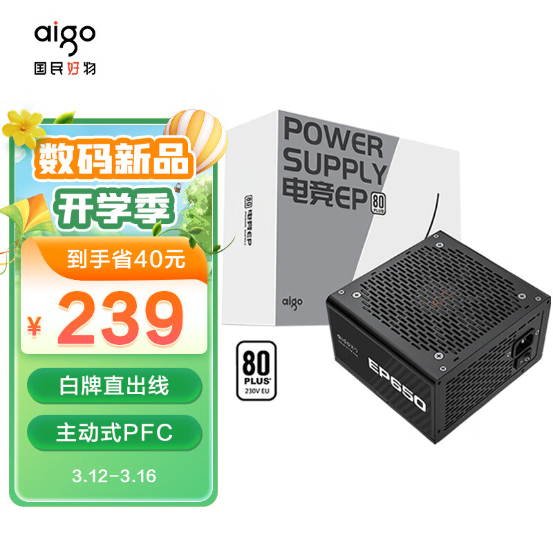 爱国者(aigo)额定650W EP650 黑色 电脑主机电源 (80Plus白牌/主动式PFC/支持背线/大单路12V)价格:239.00元!