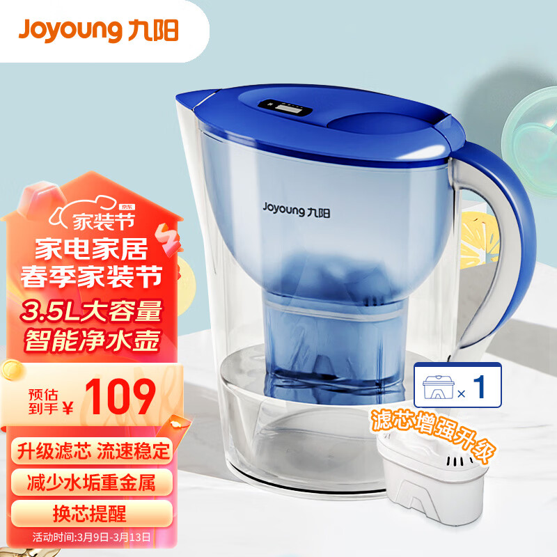 九阳(Joyoung)过滤净水器 家用滤水壶 净水壶(一壶1芯 ) 3.5L(蓝色)四重过滤 智能换芯提醒 JYW-B05E价格:109.00元!