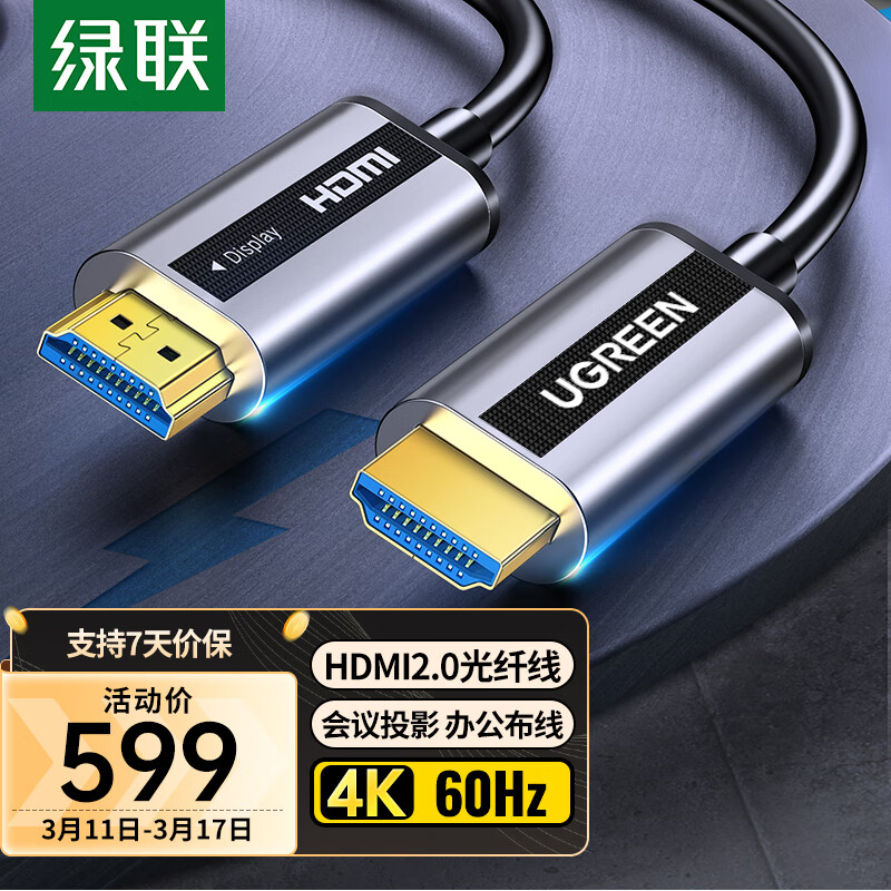 绿联光纤HDMI线2.0版 4K60Hz发烧级高清线电脑机顶盒连接电视投影仪显示器3D视频线工程装修连接线50米价格:699.00元!