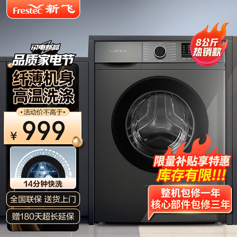 新飞(Frestec)8公斤滚筒洗衣机全自动 大容量 欧标 健康除螨洗省电节能 XQG80-1001TYD价格:999.00元!