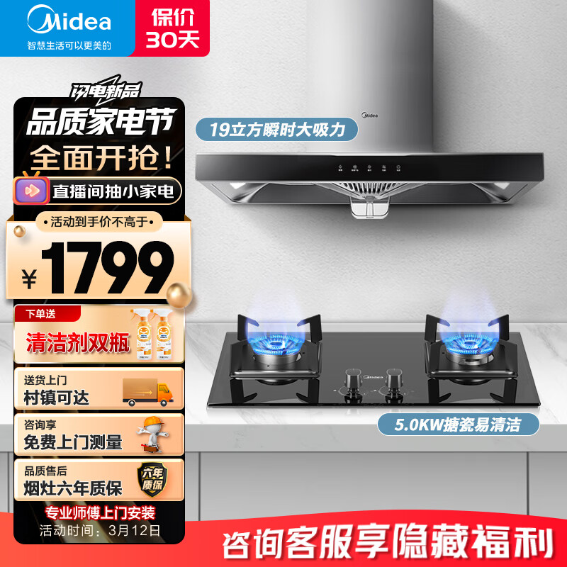 美的(Midea)烟灶套装 小尺寸欧式抽油烟机家用 5KW钢化玻璃双灶 油烟机燃气灶套装T33A+Q330液化气价格:1799.00元!