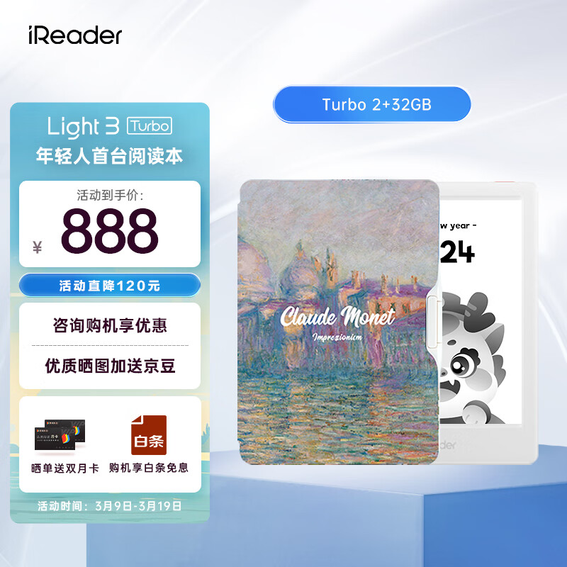 掌阅iReader Light3 Turbo智能阅读本 电子书阅读器 6英寸墨水屏电纸书 32G 告白 莫奈运河·翻页键套装价格:888.00元!