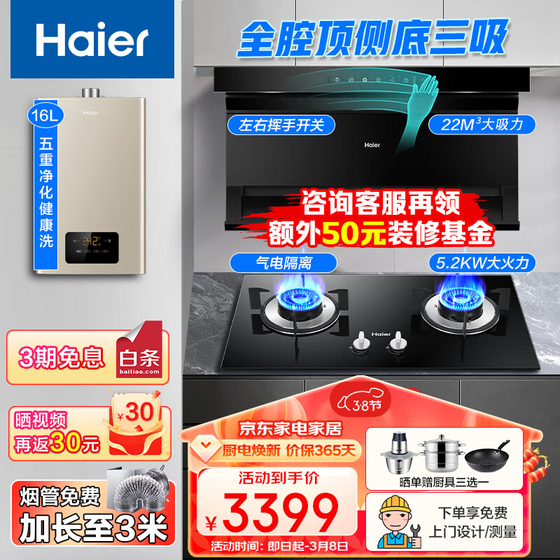 海尔(Haier)抽油烟机燃气灶套装22m3挥手智控顶侧双吸EC710+5.2KW灶Q2BE50+16升热水器16K3BD厨房三件套[家电]价格:3599.00元!