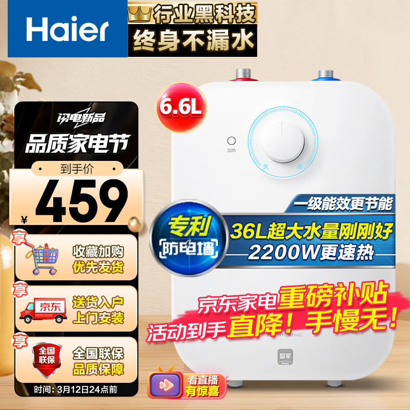 海尔(Haier)6.6升上出水小厨宝 2200W家用厨房速热电热水器 小巧尺寸一级能效节能 EC6.6FA价格:457.00元!