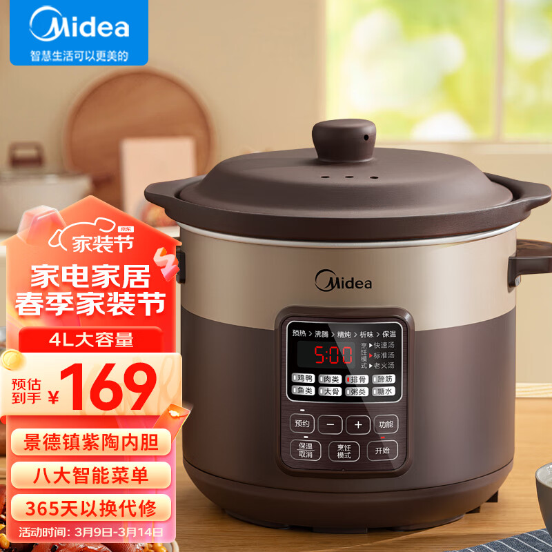 美的(Midea)电炖锅 电炖盅 紫砂锅 电砂锅煲汤锅 炖汤锅 燕窝炖盅 煮粥神器 家用4L 智能预约 WTGS401价格:169.00元!