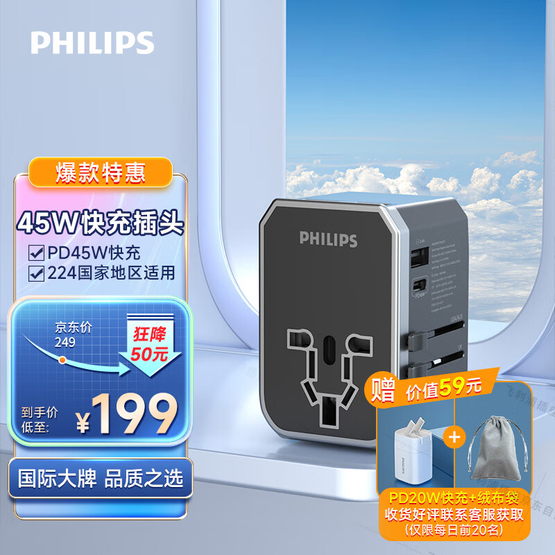 飞利浦(PHILIPS)通用出国旅行转换器/国际转换插头插座//英标欧标美标澳标日本适用45wPD快充1003A价格:199.00元!