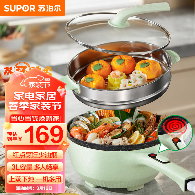 苏泊尔(SUPOR)电炒锅 电煮锅 电蒸锅 电火锅 电热锅 家用多功能 一体 电锅蒸煮炒菜 3L多用途锅JD24D833配蒸笼价格:169.00元!
