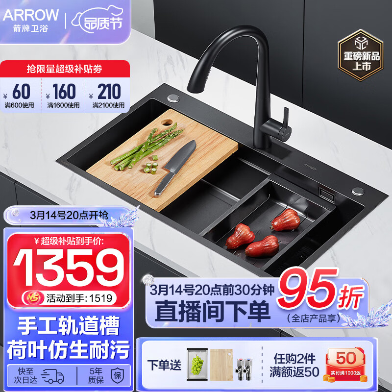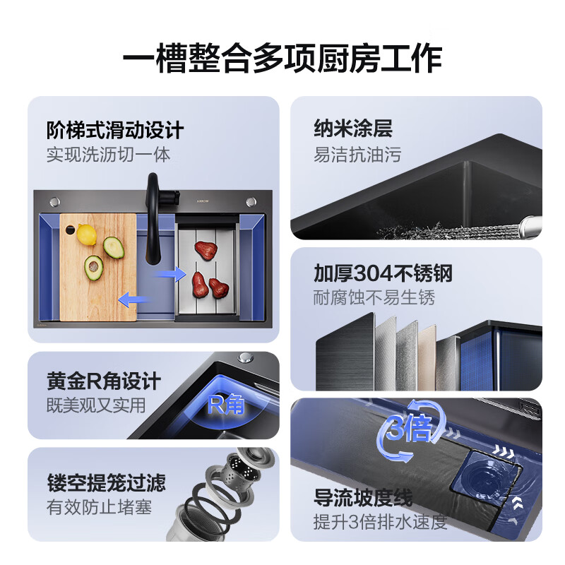 箭牌(ARROW)304不锈钢水槽纳米轨道大单槽厨房洗菜盆洗菜池洗碗一体盆 70黑色纳米轨道槽-含抽拉龙头价格:1739.00元!