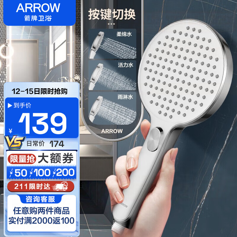 箭牌(ARROW)手持花洒套装增压宽屏超大加厚面板淋浴手持莲蓬头花洒喷头 增压加厚手持(圆形)价格:173.75元!