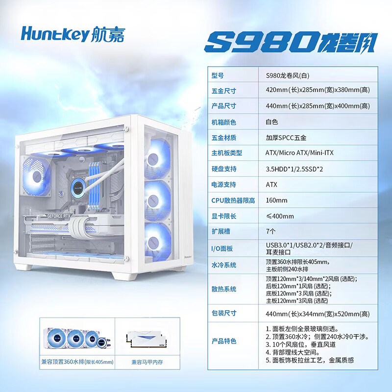 航嘉(Huntkey)S980龙卷风白色海景房机箱(钢化玻璃/左右分区/360水冷/10个风扇位/ATX主板/40系显卡)价格:289.00元!